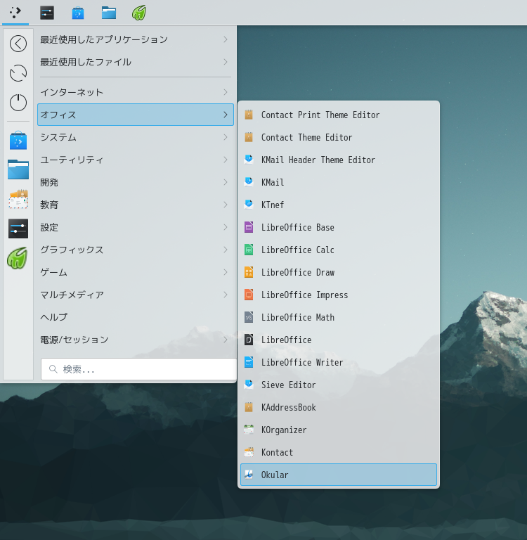1. 概要 ドキュメントビューアとして。「Okular」を使用します。 「Okular」は、デフォルトでインストールされています。 2. 起動 「スタート」→「オフィス」→「Okular」