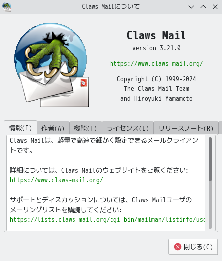 初回起動時は「設定ウィザード」から始まります。 起動直後の状態です。 2024年12月23日の時点で、下記のバージョンでした。 「設定ウィザード」他、操作方法については、「メールクライアント - Claws Mail」をご参照ください。 |