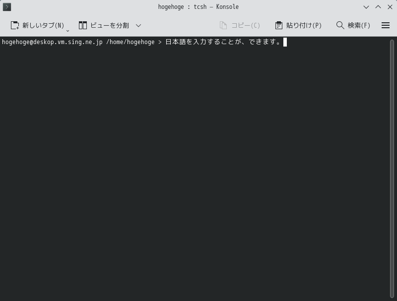 「Konsole」を開いて、日本語入力できることを確認しました。