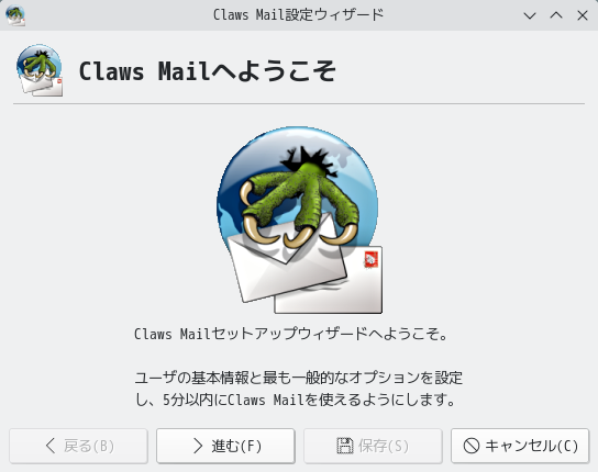 初回起動時は「設定ウィザード」から始まります。 起動直後の状態です。 2025年4月7日の時点で、下記のバージョンでした。 「設定ウィザード」他、操作方法については、「メールクライアント - Claws Mail」をご参照ください。 |