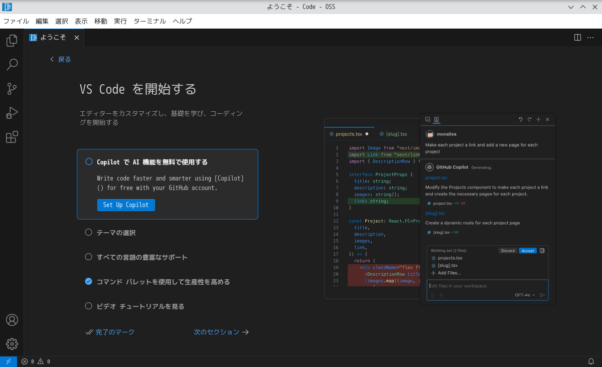 日本語化後に起動した直後の状態です。 2024年12月25日の時点で、下記のバージョンでした。 「Vsiual Studio Code」の操作等については「統合開発環境 Vsiual Studio Code」をご参照ください。 |