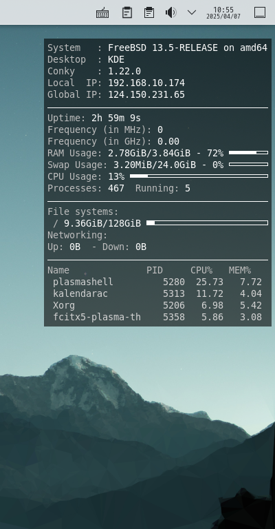 本ページ以外の詳細な設定に関しては、「共通事項 - タスクマネージャ Conky - FreeBSD の設定」の「FreeBSD 13.5 RELEASE」の項をご参照ください。