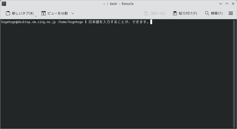 「Konsole」を開いて、日本語入力できることを確認しました。
