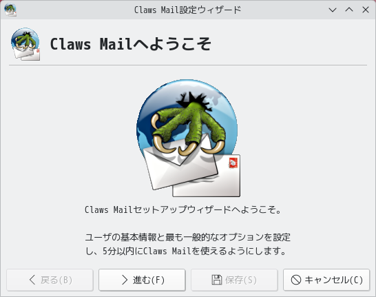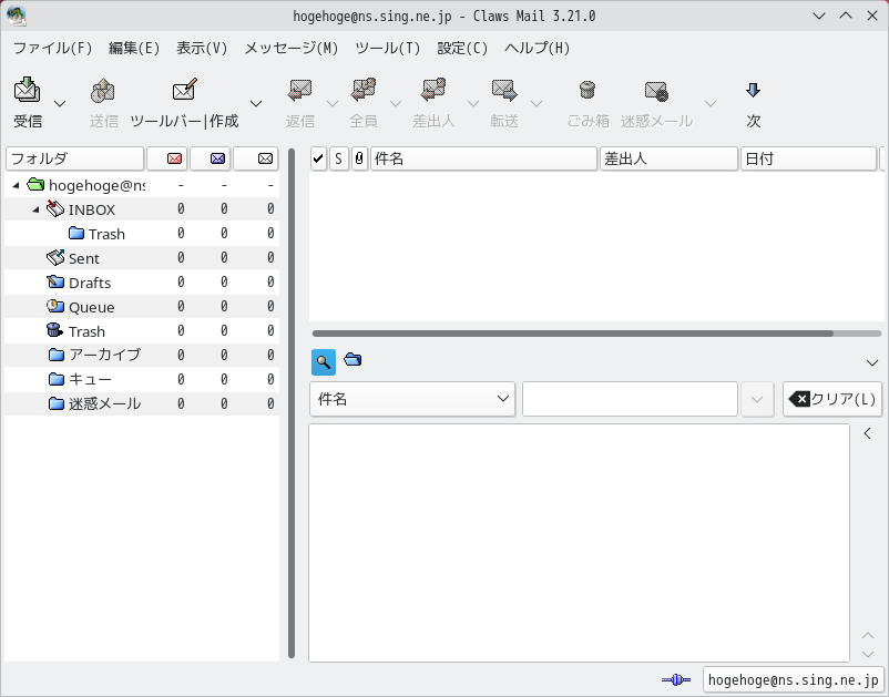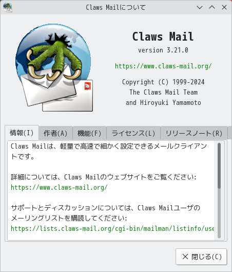 初回起動時は「設定ウィザード」から始まります。 起動直後の状態です。 2025年12月24日の時点で、下記のバージョンでした。 「設定ウィザード」他、操作方法については、「メールクライアント - Claws Mail」をご参照ください。 |