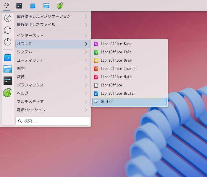 1. 概要 ドキュメントビューアとして。「Okular」を使用します。 「Okular」は、デフォルトでインストールされています。 2. 起動 「スタート」→「オフィス」→「Okular」