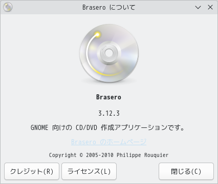 1. 概要 「Brasero」は、光学ディスク(CD・DVD)のライティングソフトです。 基本的な操作については「共通事項 - 光ディスクライティング」をご参照ください。 2. インストール 「OctoPkg」で、「brasero」を検索して、インストールします。 3. 起動 「スタート」→「マルチメディア」→「Brasero」