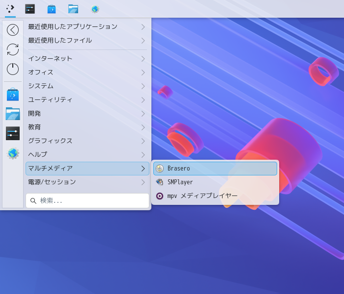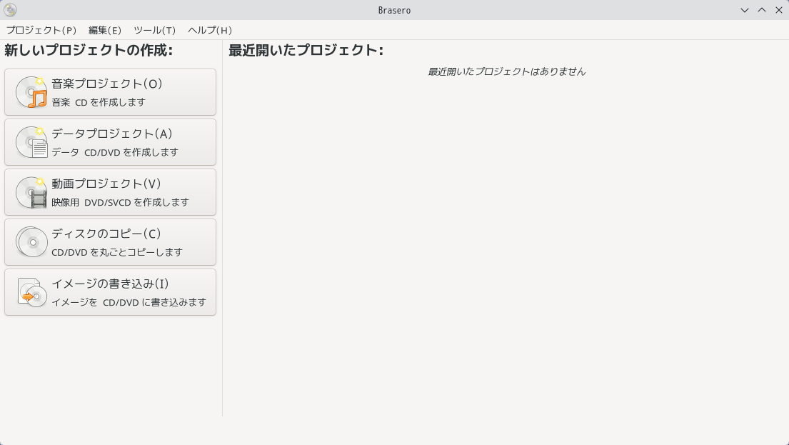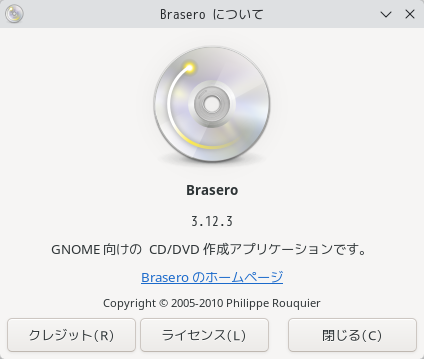 1. 概要 「Brasero」は、光学ディスク(CD・DVD)のライティングソフトです。 基本的な操作については「共通事項 - 光ディスクライティング」をご参照ください。 2. インストール 「OctoPkg」で、「brasero」を検索して、インストールします。 3. 起動 「スタート」→「マルチメディア」→「Brasero」