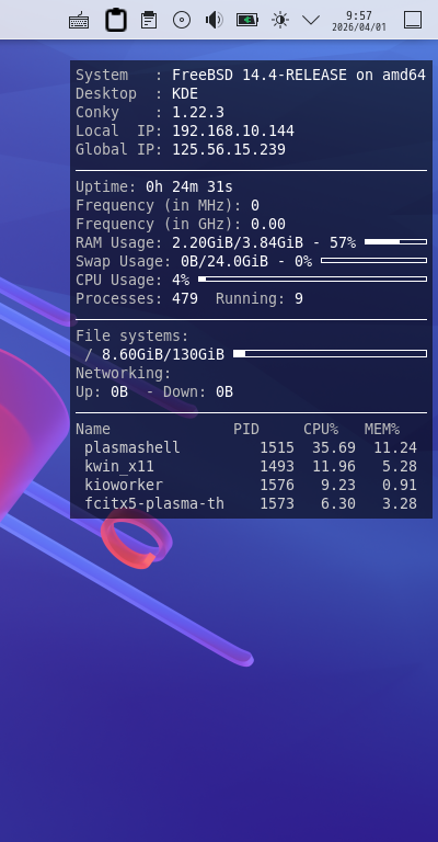 本ページ以外の詳細な設定に関しては、「共通事項 - タスクマネージャ Conky - FreeBSD の設定」の「FreeBSD 14.4 RELEASE」の項をご参照ください。
