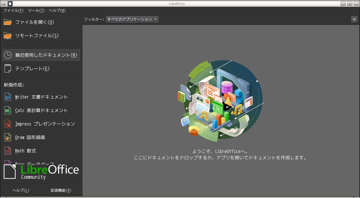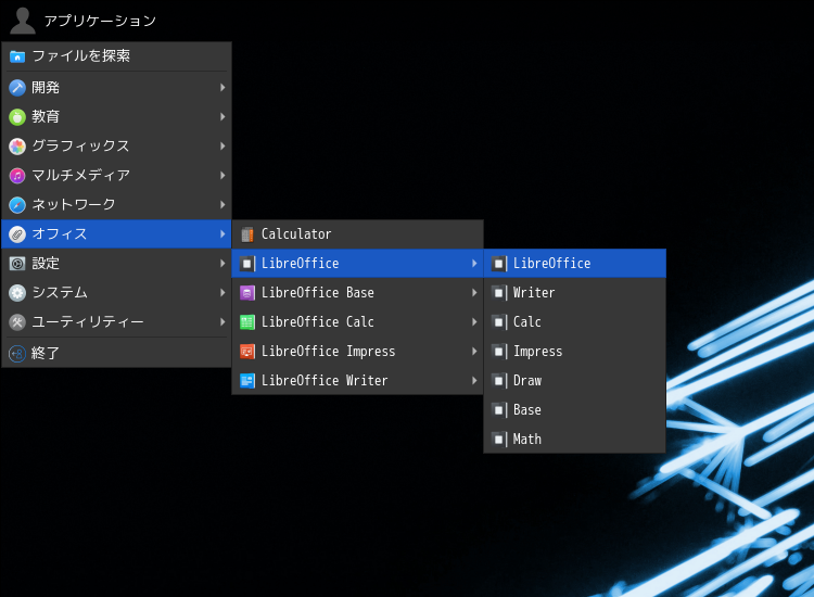 1. 概要 オフィススイートとして、「LibreOffice」を使用します。 2. インストール 「OctoPkg」で、「ja-libreoffice」を検索して、インストールします。 3. 起動 「アプリケーション」→「オフィス」→「LibreOffice」→「LibreOffice」