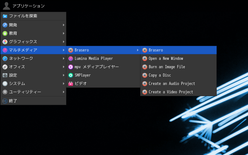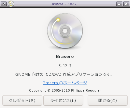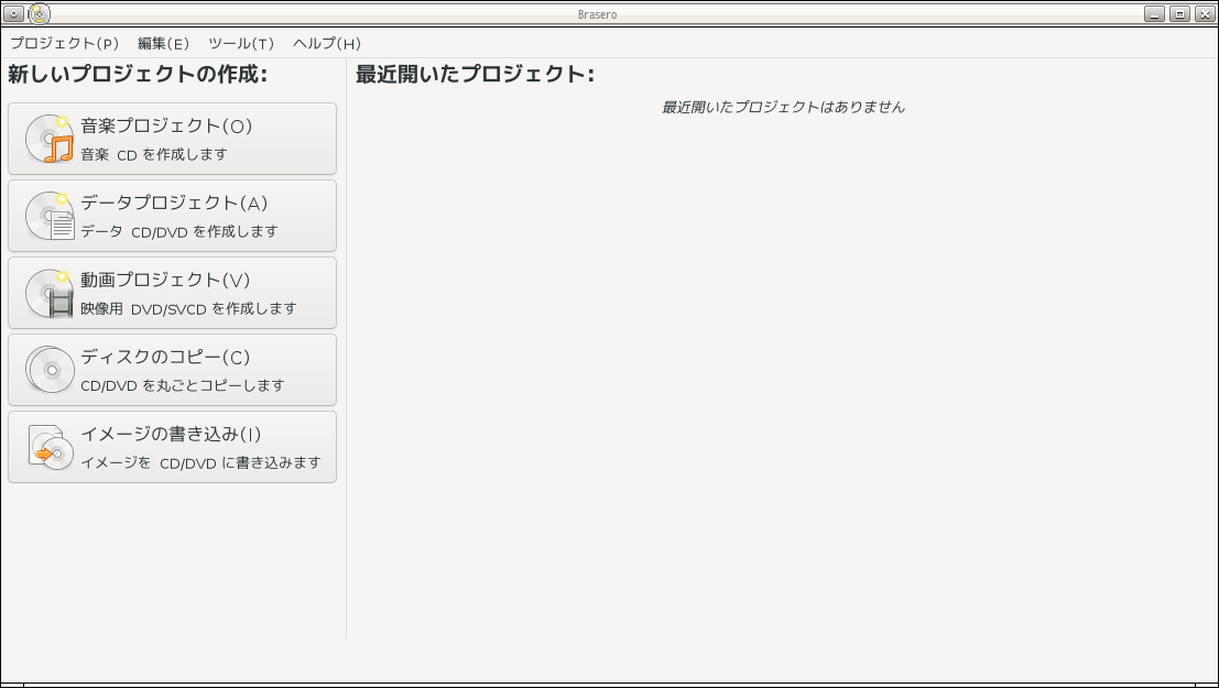 1. 概要 「Brasero」は、光学ディスク(CD・DVD)のライティングソフトです。 基本的な操作については「共通事項 - 光ディスクライティング」をご参照ください。 2. インストール 「OctoPkg」で、「brasero」を検索して、インストールします。 インストール直後に起動すると、起動できないことがあります。 そういう場合は、一度ログインしなおします。 3. 起動 「アプリケーション」→「マルチメディア」→「Brasero」→「Brasero」