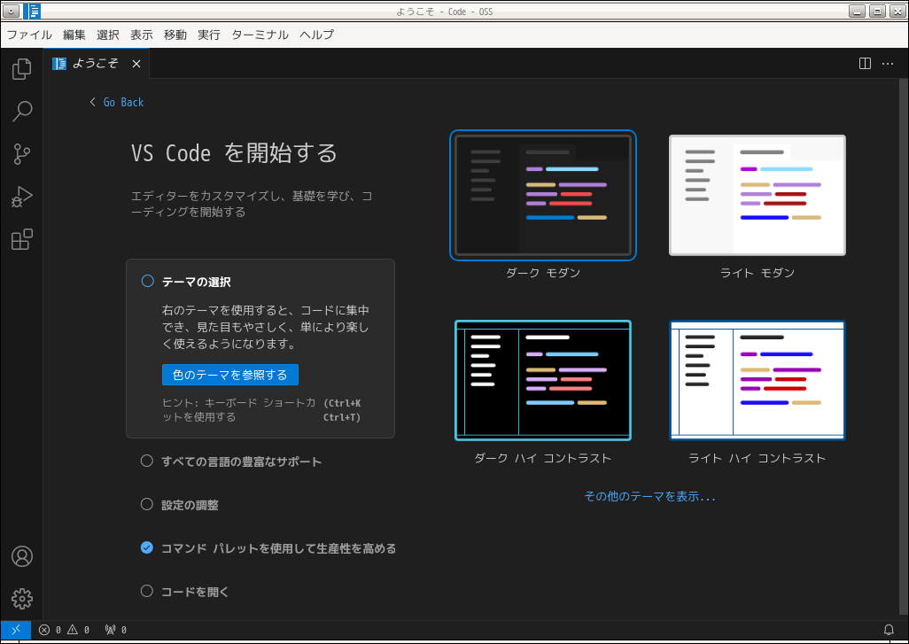日本語化後、再起動直後の状態です。 2024年10月17日の時点で、下記のバージョンでした。 「Visual Studio Code」の操作等については「統合開発環境 Visual Studio Code」をご参照ください。 |