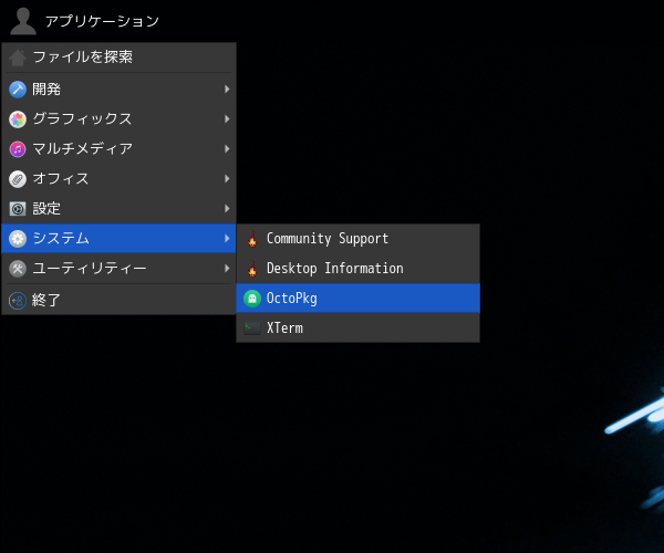 1. 概要 「OctoPkg」は、パッケージ管理(pkg)のグラフィカルフロントエンドです。 基本的な操作については共通事項の「パッケージ管理 OctoPkg」を参照してください。 2. インストール ここまでは、コマンドでインストールしなければならない。 「root」ユーザ権限で。 pkg install -y octopkg 3. 起動 「アプリケーション」→「システム」→「OctoPkg」