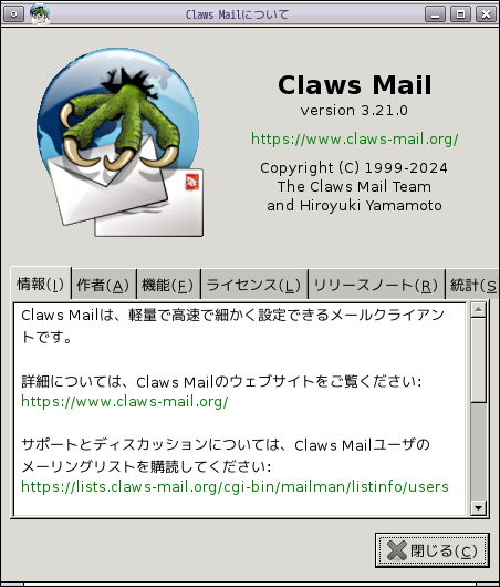 初回起動時は「設定ウィザード」から始まります。 起動直後の状態です。 2024年12月11日の時点で、下記のバージョンでした。 「設定ウィザード」他、操作方法については、「メールクライアント - Claws Mail」をご参照ください。 |
