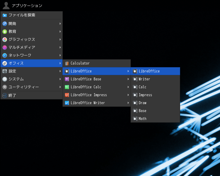 1. 概要 オフィススイートとして、「LibreOffice」を使用します。 2. インストール 「OctoPkg」で、「ja-libreoffice」を検索して、インストールします。 3. 起動 「アプリケーション」→「オフィス」→「LibreOffice」→「LibreOffice」