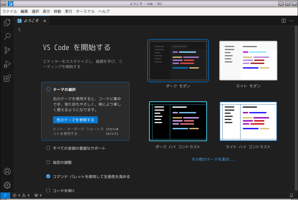 日本語化後、再起動直後の状態です。 2024年12月16日の時点で、下記のバージョンでした。 「Visual Studio Code」の操作等については「統合開発環境 Visual Studio Code」をご参照ください。 |