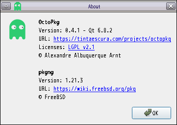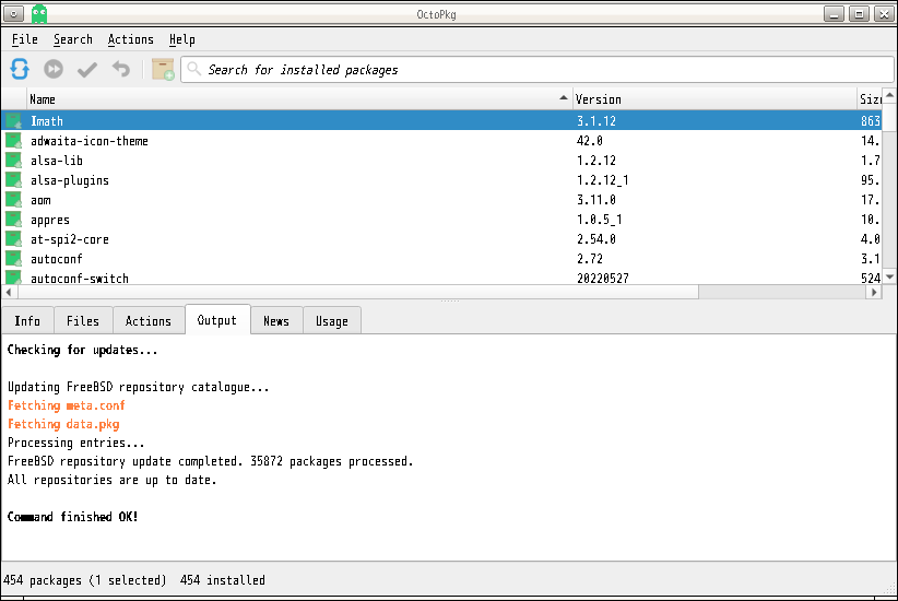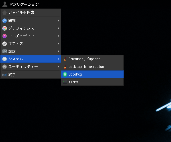 1. 概要 「OctoPkg」は、パッケージ管理(pkg)のグラフィカルフロントエンドです。 基本的な操作については共通事項の「パッケージ管理 OctoPkg」を参照してください。 2. インストール ここまでは、コマンドでインストールしなければならない。 「root」ユーザ権限で。 pkg install -y octopkg 3. 起動 「アプリケーション」→「システム」→「OctoPkg」
