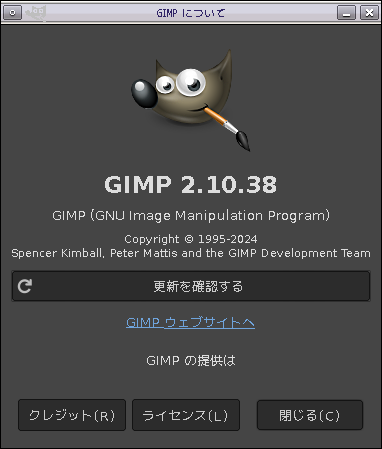 起動直後の状態です。 2025年4月8日の時点で、下記のバージョンでした。 操作については、「画像編集ソフト GIMP2」に掲載しています。 上記は簡単なものですので、詳細なものがほしい方は、各所に初歩の手引きから応用編までありますので、そちらを参考にしてください。 |
