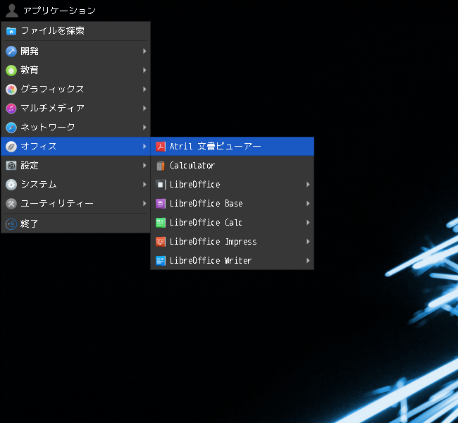 1. 概要 ドキュメントビューアとして。「Atril」を使用します。 2. インストール 「OctoPkg」で、「atril」を検索して、インストールします。 3. 起動 「アプリケーション」→「オフィス」→「Artil ドキュメントビューア」