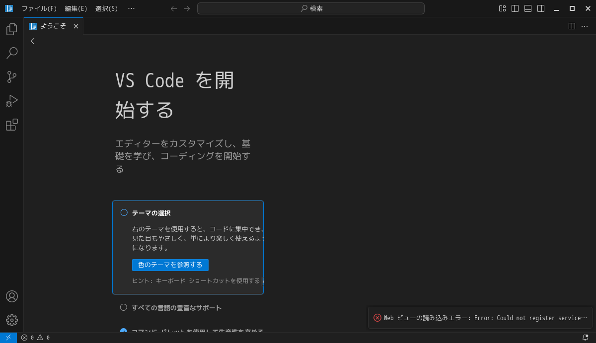 日本語化後、再起動直後の状態です。 2025年6月24日の時点で、下記のバージョンでした。 「Visual Studio Code」の操作等については「統合開発環境 Visual Studio Code」をご参照ください。 |