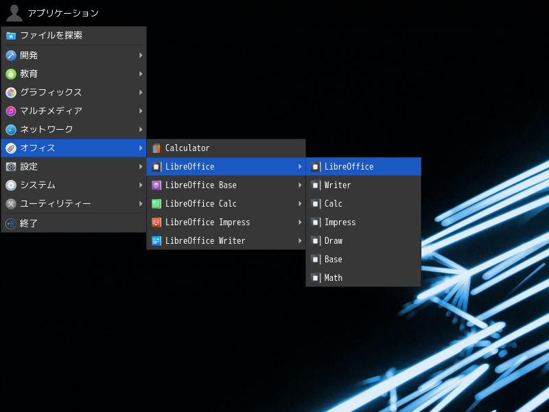 1. 概要 オフィススイートとして、「LibreOffice」を使用します。 2. インストール 「OctoPkg」で、「ja-libreoffice」を検索して、インストールします。 3. 起動 「アプリケーション」→「オフィス」→「LibreOffice」→「LibreOffice」