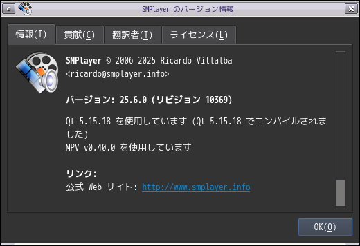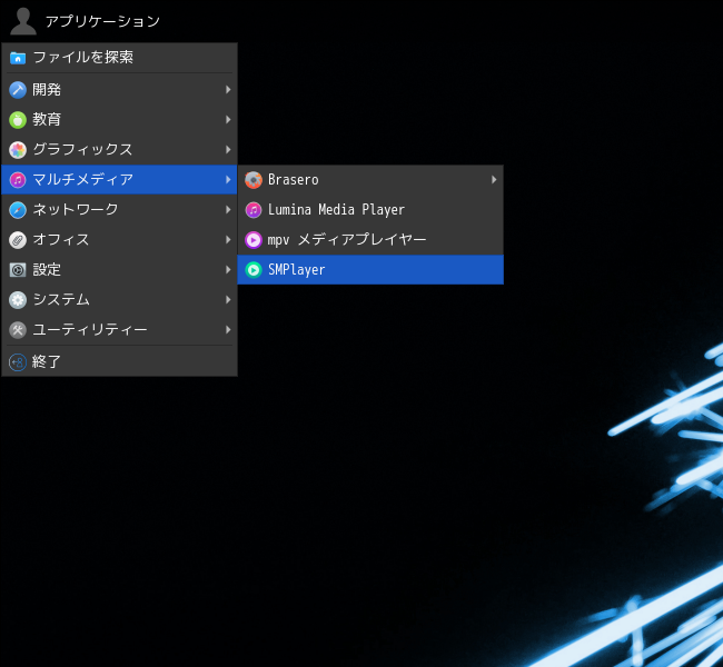 1. 概要 マルチメディアプレイヤーとして、「SMPlayer」を使用します。 2. インストール 「OctoPkg」で、「smplayer」を検索して、インストールします。 3. 起動 「アプリケーション」→「マルチメディア」→「SMPlayer」