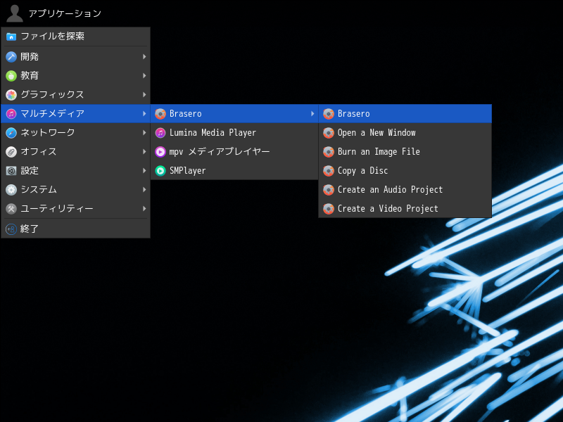 「アプリケーション」→「マルチメディア」→「Brasero」→「Brasero」