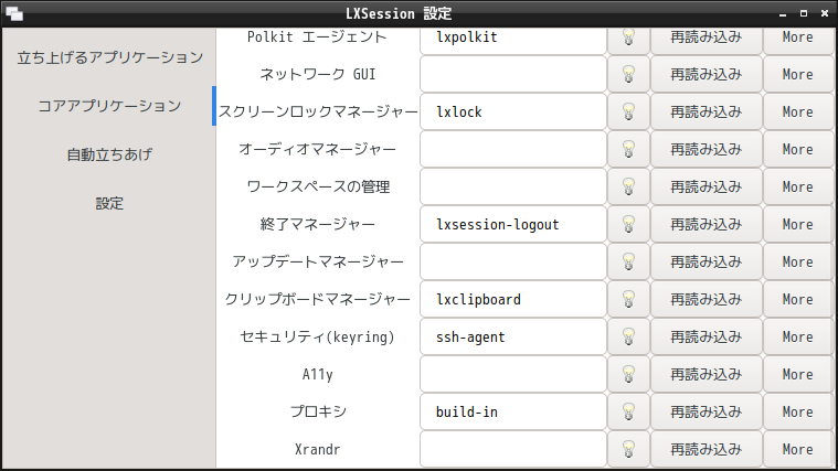「スタート」→「設定」→「LXSession のデフォルトのアプリケーション」で「LXSession の設定」を開いて