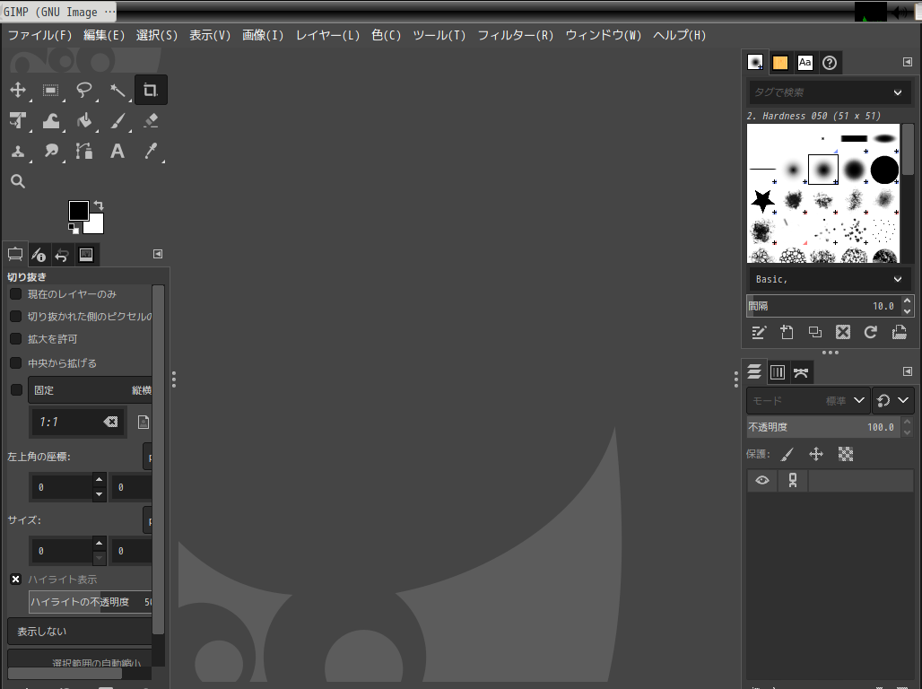 起動直後の状態です。 2024年12月16日の時点で、下記のバージョンでした。 操作については、「画像編集ソフト GIMP2」に掲載しています。 上記は簡単なものですので、詳細なものがほしい方は、各所に初歩の手引きから応用編までありますので、そちらを参考にしてください。 |