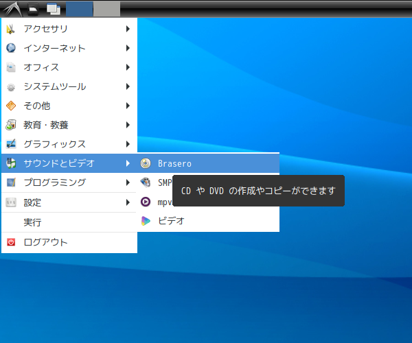 1. 概要 「Brasero」は、光学ディスク(CD・DVD)のライティングソフトです。 基本的な操作については「共通事項 - 光ディスクライティング」をご参照ください。 2. インストール 「OctoPkg」で、「brasero」を検索して、インストールします。 初回起動時、うまく起動できないときがあります。 そういう場合は、一度ログインしなおします。 3. 起動 「スタート」→「サウンドとビデオ」→「Brasero」