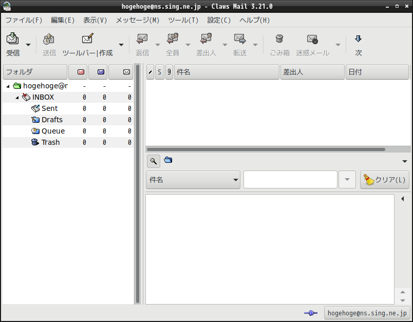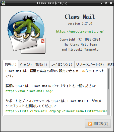 初回起動時は「設定ウィザード」から始まります。 起動直後の状態です。 2025年4月10日の時点で、下記のバージョンでした。 「設定ウィザード」他、操作方法については、「メールクライアント - Claws Mail」をご参照ください。 |