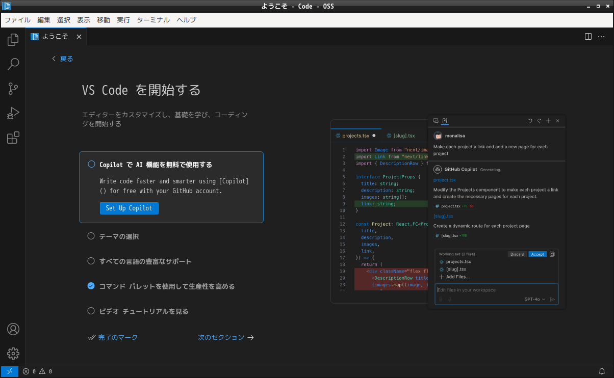 1. 概要 開発環境として、「Visual Studio Code」を使用します。 2. インストール 「OctoPkg」で、「vscode」を検索して、インストールします。 3. 起動 「スタート」→「プログラミング」→「Code - OSS」