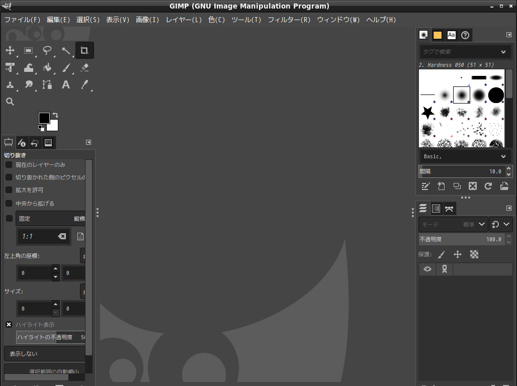 起動直後の状態です。 2025年6月25日の時点で、下記のバージョンでした。 操作については、「画像編集ソフト GIMP」に掲載しています。 上記は簡単なものですので、詳細なものがほしい方は、各所に初歩の手引きから応用編までありますので、そちらを参考にしてください。 |