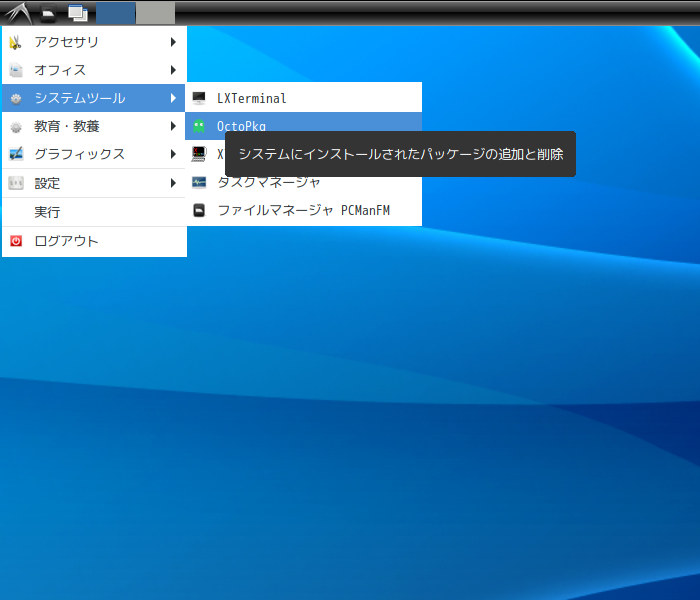 1. 概要 「OctoPkg」は、パッケージ管理(pkg)のグラフィカルフロントエンドです。 基本的な操作については共通事項の「パッケージ管理 OctoPkg」を参照してください。 2. インストール ここまでは、コマンドでインストールしなければならない。 「root」ユーザ権限で。 pkg install -y octopkg 3. 起動 「スタート」→「システムツール」→「OctoPkg」