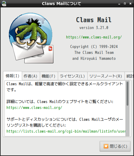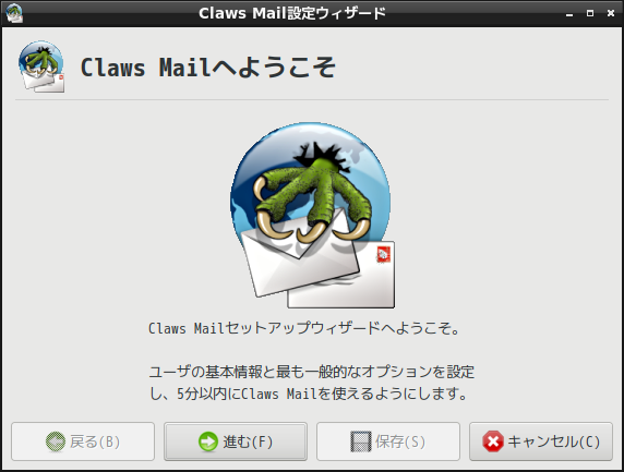 初回起動時は「設定ウィザード」から始まります。 起動直後の状態です。 2025年12月19日の時点で、下記のバージョンでした。 「設定ウィザード」他、操作方法については、「メールクライアント - Claws Mail」をご参照ください。 |
