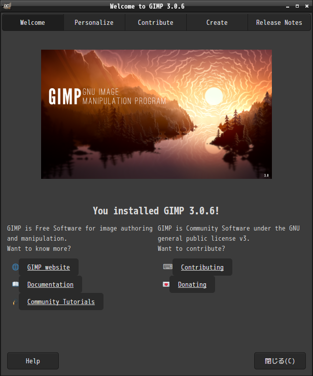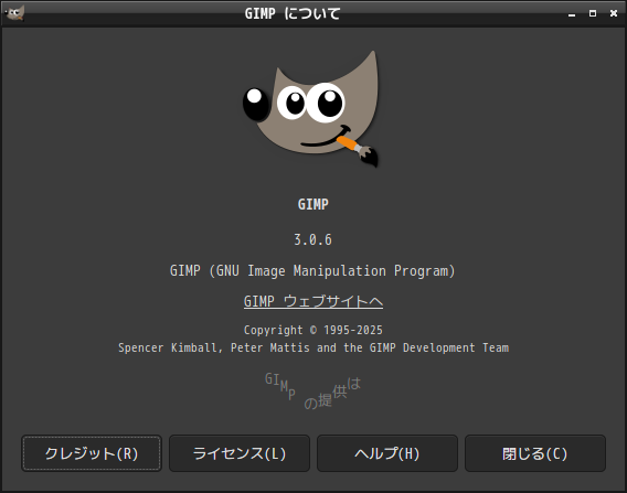 「閉じる」 起動直後の状態です。 2026年4月3日の時点で、下記のバージョンでした。 操作については、「画像編集ソフト - GIMP」に掲載しています。 上記は簡単なものですので、詳細なものがほしい方は、各所に初歩の手引きから応用編までありますので、そちらを参考にしてください。 |
