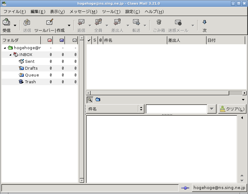 初回起動時は「設定ウィザード」から始まります。 起動直後の状態です。 2024年12月18日の時点で、下記のバージョンでした。 「設定ウィザード」他、操作方法については、「メールクライアント - Claws Mail」をご参照ください。 |