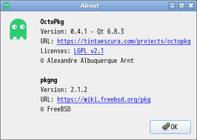1. 概要 「OctoPkg」は、パッケージ管理(pkg)のグラフィカルフロントエンドです。 基本的な操作については共通事項の「パッケージ管理 OctoPkg」を参照してください。 2. インストール ここまでは、コマンドでインストールしなければならない。 「root」ユーザ権限で。 pkg install -y octopkg 3. 起動 「スタート」→「システムツール」→「OctoPkg」