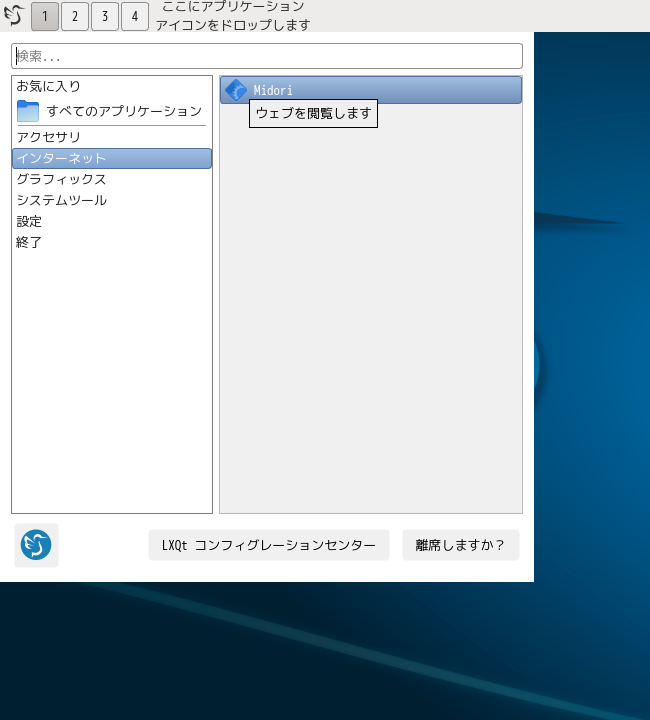 1. 概要 ブラウザとして、「Midori」を使用します。 2. インストール 「OctoPkg」で、「midori」を検索して、インストールします。 3. 起動 「スタート」→「インターネット」→「Midori」