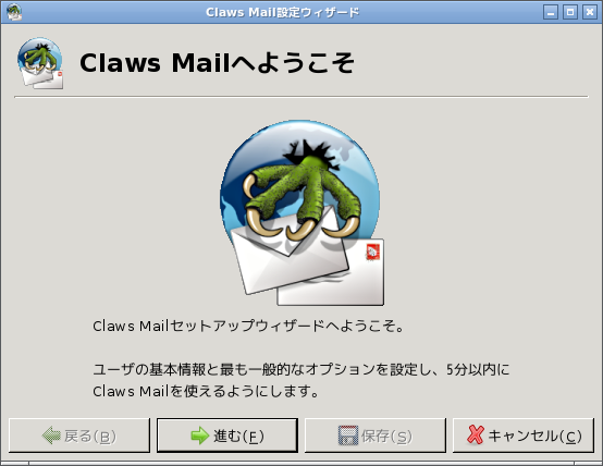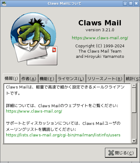初回起動時は「設定ウィザード」から始まります。 起動直後の状態です。 2025年5月15日の時点で、下記のバージョンでした。 「設定ウィザード」他、操作方法については、「メールクライアント - Claws Mail」をご参照ください。 |