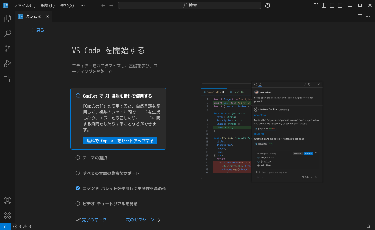 日本語化後、再起動直後の状態です。 2025年5月16日の時点で、下記のバージョンでした。 「Visual Studio Code」の操作等については「統合開発環境 Visual Studio Code」をご参照ください。 |