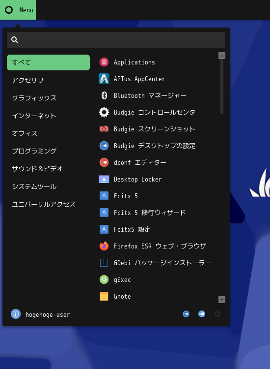 まぁ、悪くはない。 ただし、アイコン横の「Menu」の文字は、いらんわな。 3. 設定 文字をとるには。 「BUDGIE デスクトップの設定」を開いて。 「パネル」「設定」「BUDGIE Menu」で。 「メニューラベルの表示」をオフにしてやれば、消えます。