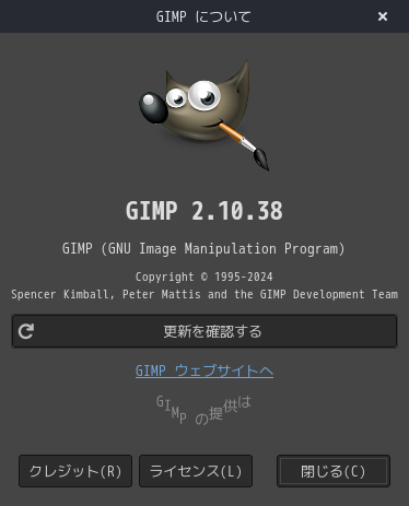 起動直後の状態です。 2024年10月15日の時点で、下記のバージョンでした。 操作については、「画像編集ソフト GIMP2」に掲載しています。 上記は簡単なものですので、詳細なものがほしい方は、各所に初歩の手引きから応用編までありますので、そちらを参考にしてください。 |
