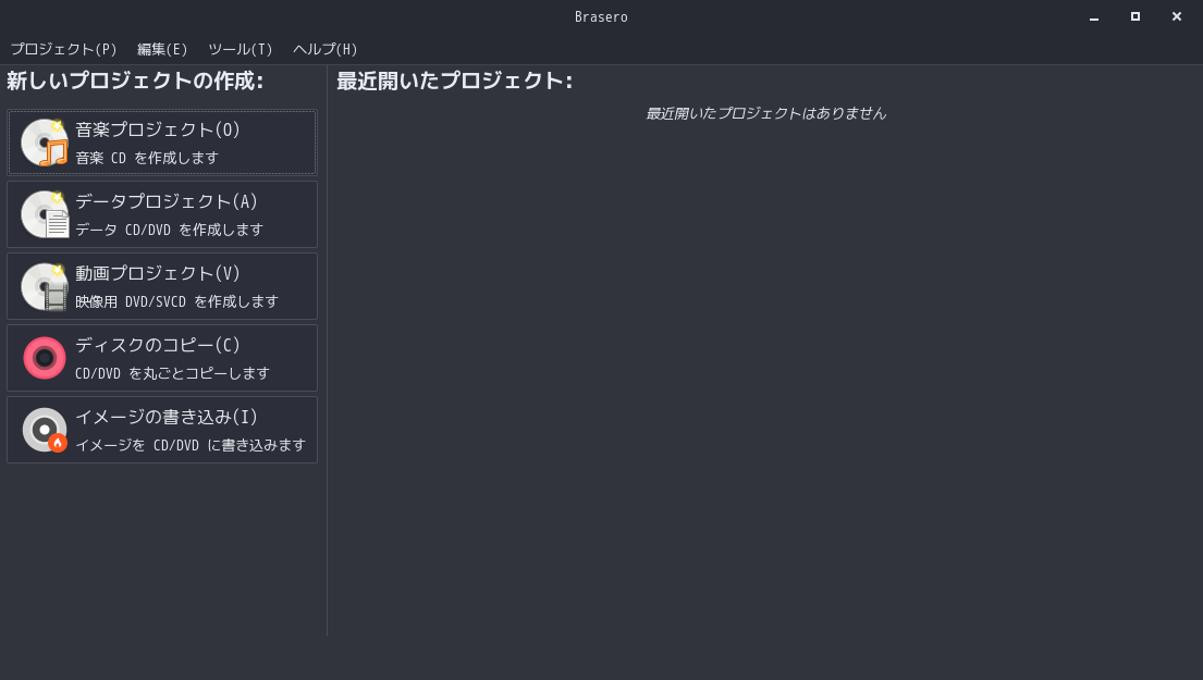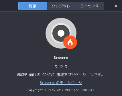 光学ディスク(CD・DVD)のライティングソフトとして、「Brasero」を使用します。