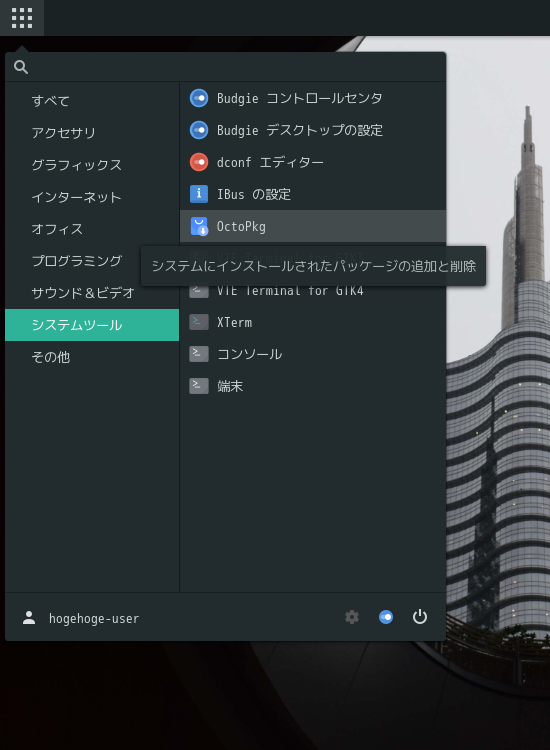 1. 概要 「OctoPkg」は、パッケージ管理(pkg)のグラフィカルフロントエンドです。 基本的な操作については共通事項の「パッケージ管理 OctoPkg」を参照してください。 2. インストール 「root」ユーザ権限で。 pkg install -y octopkg 3. 起動 「スタート」→「システムツール」→「OctoPkg」