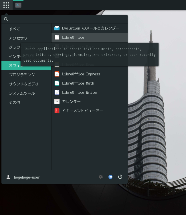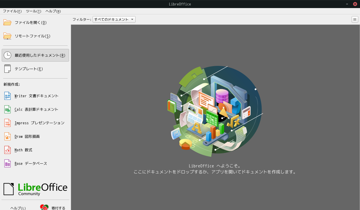 1. 概要 オフィススイートとして、「LibreOffice」を使用します。 2. インストール 「OctoPkg」で、「ja-libreoffice」を検索して、インストールします。 3. 起動 「スタート」→「オフィス」→「LibreOffice」