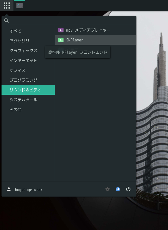1. 概要 マルチメディアプレイヤーとして、「SMPlayer」を使用します。 2. インストール 「OctoPkg」で、「smplayer」を検索して、インストールします。 3. 起動 「スタート」→「サウンドとビデオ」→「SMPlayer」