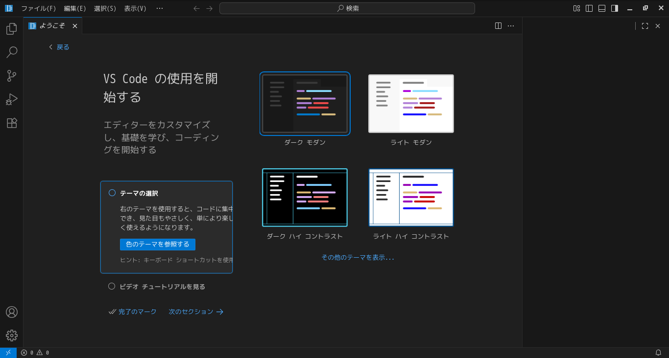 日本語化後、再起動直後の状態です。 2025年10月28日の時点で、下記のバージョンでした。 「Visual Studio Code」の操作等については「統合開発環境 Visual Studio Code」をご参照ください。 |
