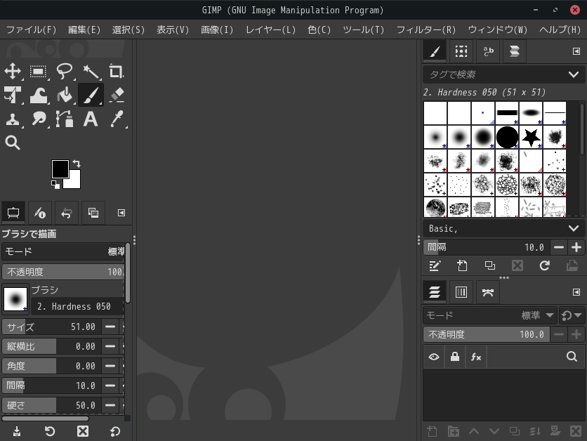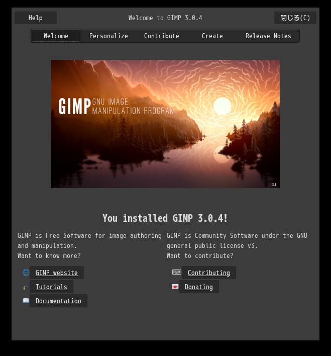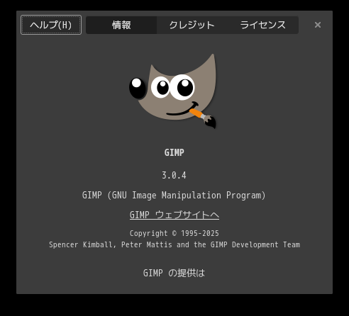 「閉じる」 起動直後の状態です。 2025年12月29日の時点で、下記のバージョンでした。 操作については、「画像編集ソフト - GIMP」に掲載しています。 上記は簡単なものですので、詳細なものがほしい方は、各所に初歩の手引きから応用編までありますので、そちらを参考にしてください。 |