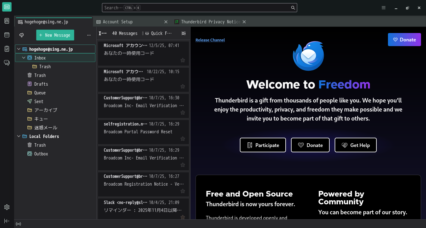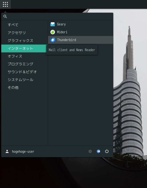 1. 概要 メールクライアントとして、「Claws Mail」を使用します。 「アカウント設定」他、操作については「メール クライアント ソフト - Thunderbird」をご参照ください。 2. インストール 「OctoPkg」で、「thunderbird」を検索して、インストールします。 3. 起動 「スタート」→「インターネット」→「Thunderbird」