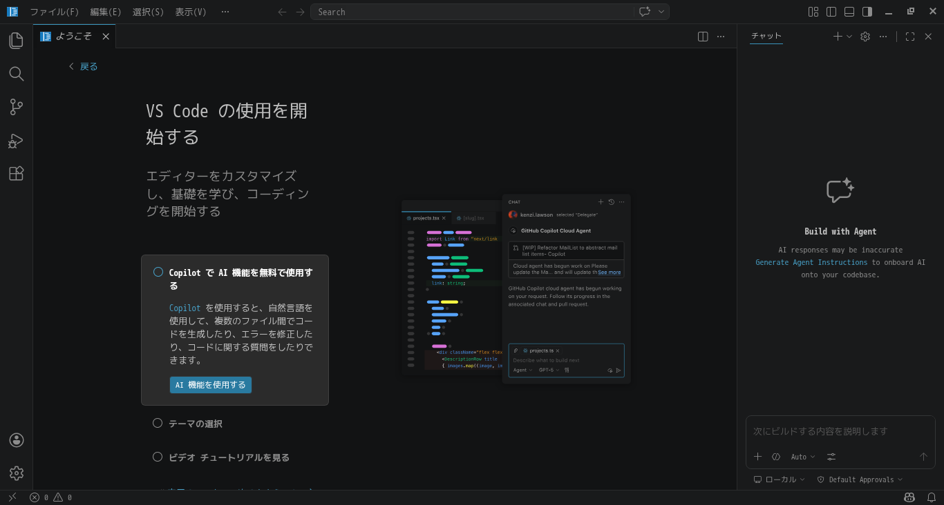 日本語化後、再起動直後の状態です。 2026年4月7日の時点で、下記のバージョンでした。 「Visual Studio Code」の操作等については「統合開発環境 Visual Studio Code」をご参照ください。 |